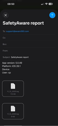 - Tap Send logs to support. This will open a new email with the application log files attached.